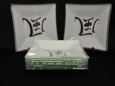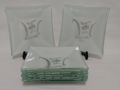 8 recipientes em vidro verde para Shoyu com kanji ao fundo. Medidas 11 cm